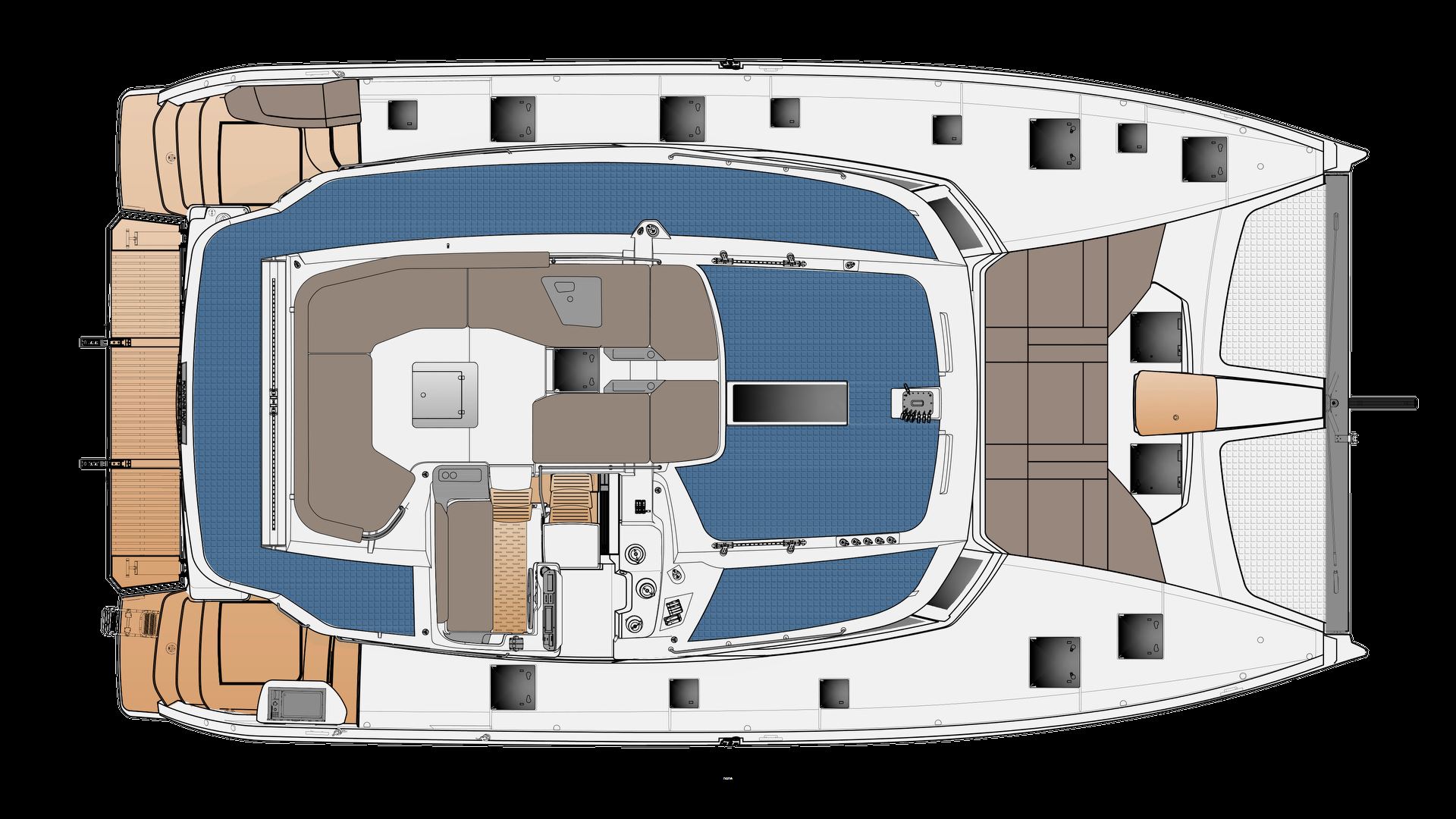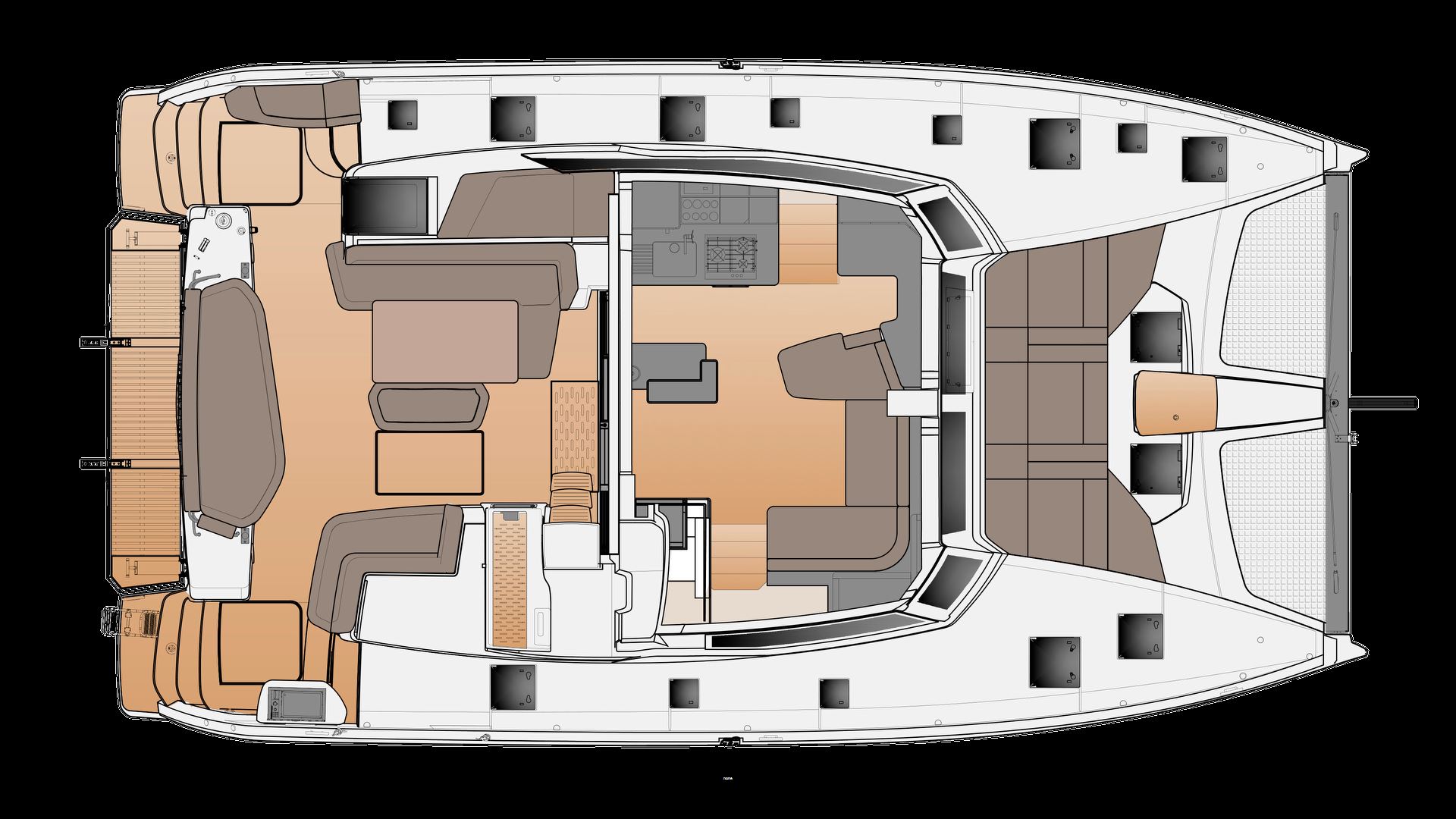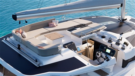 Wie Sie es von allen Fountaine Pajot- Katamaranen kennen, bietet auch auf der FP48 der halbhohe, geschützte Steuerstand die volle Rundumsicht für den Skipper. Der Steuerstand ist die ideale Verbindung von Cockpit/Lebensraum und Loungedeck für maximale Sicherheit und Geselligkeit.